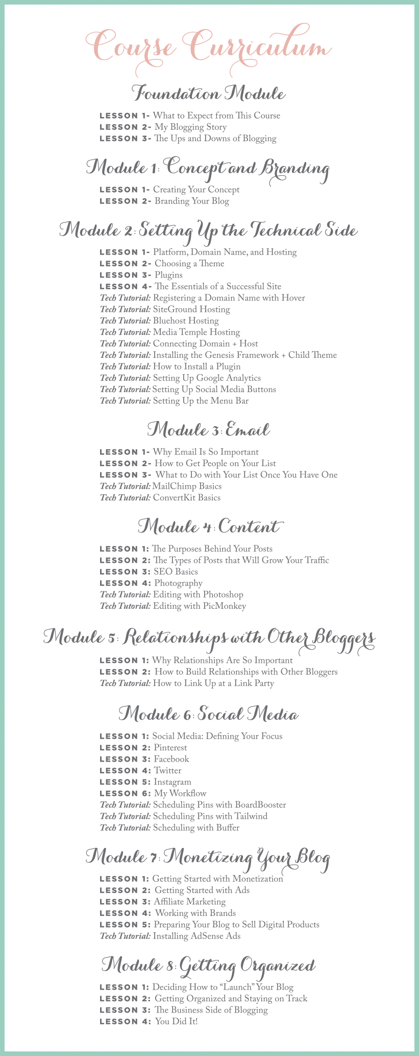The course will only yield results if you put in the work and implement the strategies described. We are confident that if you follow through and complete the work, you build an incredible blog!